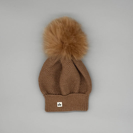 Alpakamütze Damen aus 100 % Babyalpaka mit Fellbommel (Grau, Braun)