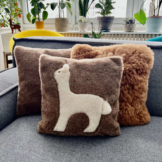 Flauschiges Alpaka Fellkissen 50x50 cm – Echtfell Kissenbezug (Braun, Schwarz)