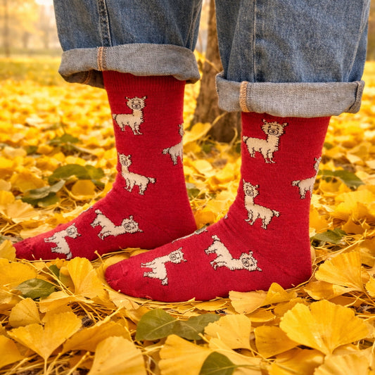 Hochwertige Alpaka Strümpfe aus 80% Baby Alpakawolle mit Alpaka-Motiv (Blau, Rot)